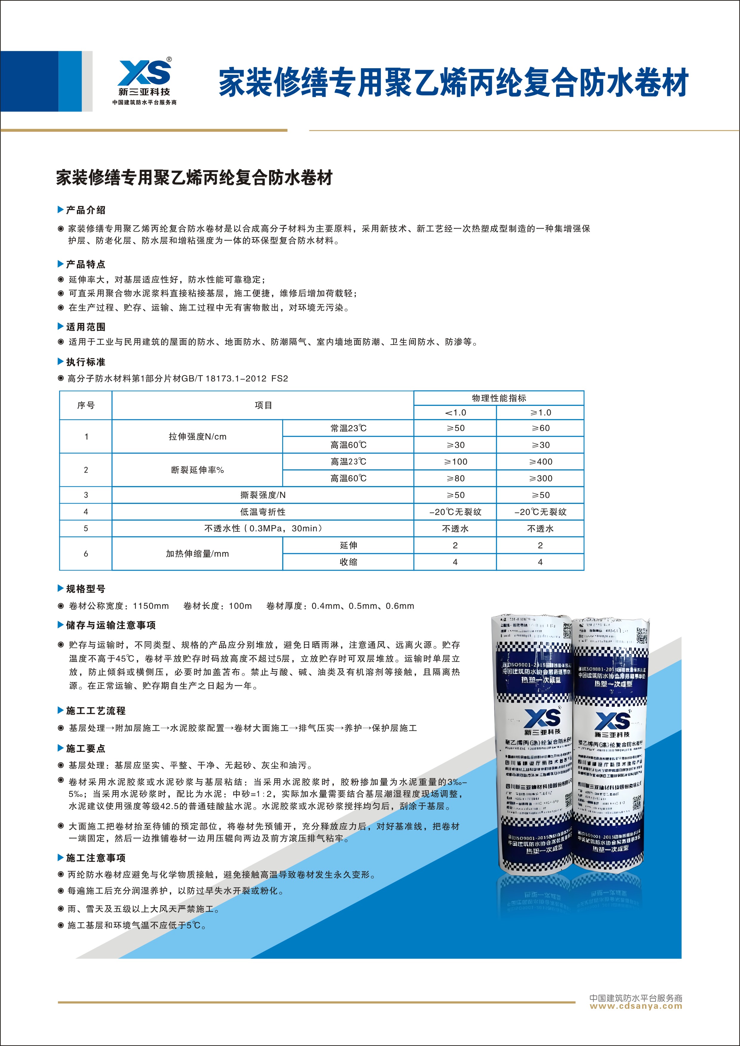 產(chǎn)品簡介: 乙烯丙綸復(fù)合防水卷材是以合成高分子材料為主要原料,采用新技術(shù)、新工藝經(jīng)一次熱塑成型制造的一種集增強(qiáng)保護(hù)層、防老化層、防水層和增粘強(qiáng)度為一體的環(huán)保型復(fù)合防水材料。 規(guī)格: FS2-PE-0.4mm 1.15m×100m | ![]() | ![]() |